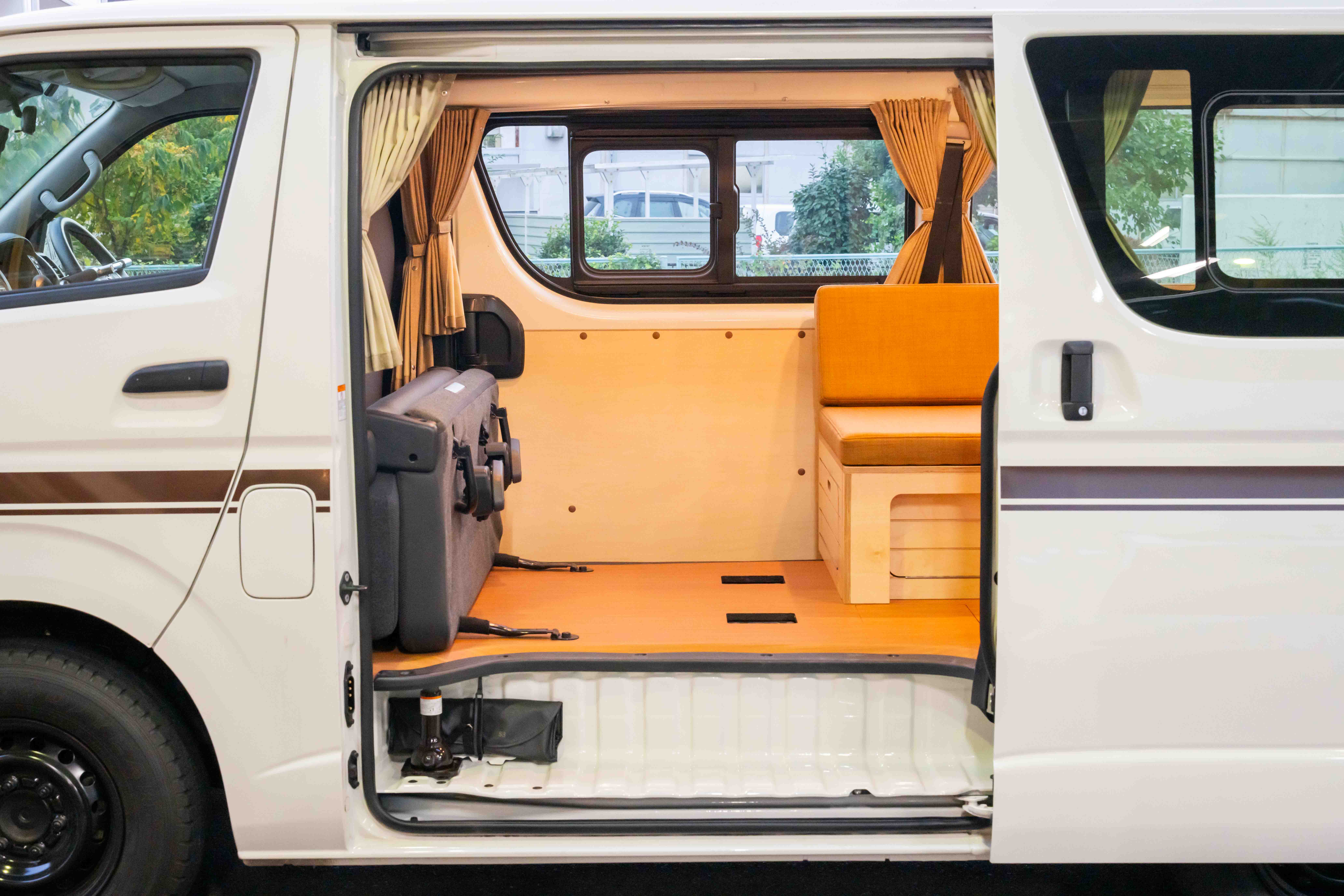 木の温もりや優しい色合いに包まれた居心地の良い車内には、 生活に必要なものをすべて完備。